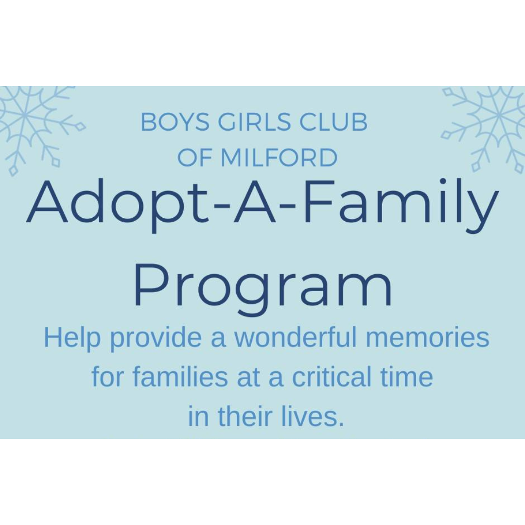 Adopt-A-Family is the Boys & Girls Club of Milford’s holiday program designed to assist families who are in crisis as a result of unemployment, homelessness, medical issues or other difficult circumstances, and who otherwise wouldn’t have the resources to celebrate the holidays.
